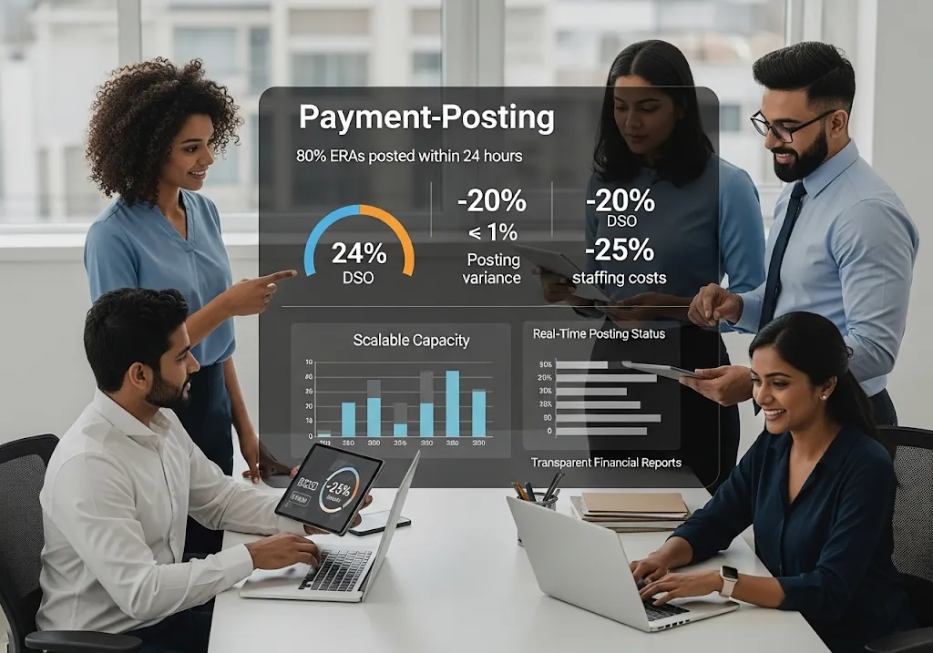 Combining expert billing professionals, AI-powered platforms, and seamless system integration, we deliver fast, accurate payment posting with transparent workflows—maximizing cash flow and ROI for your organization: